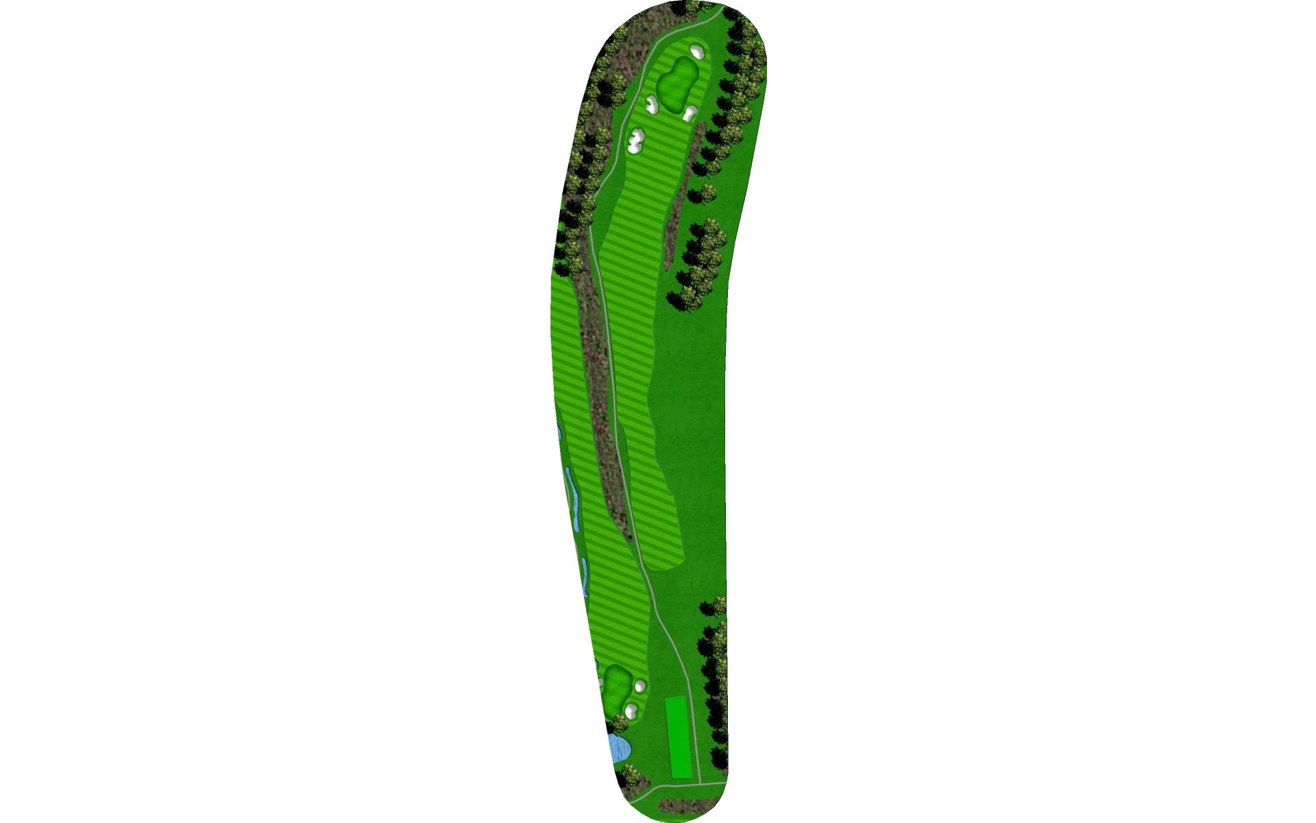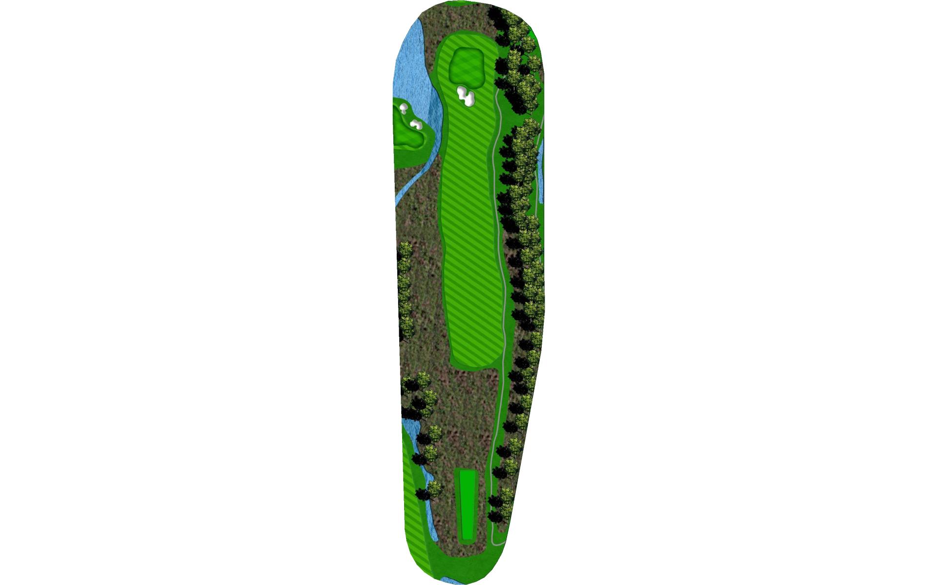 Narrow landing area. Finding the fairway is key to have a chance to reach the green in 2. If you miss the fairway you can lay up with a mid-iron to set up a short wedge for your approach shot. The green is protected by bunkers on the front left and right side.